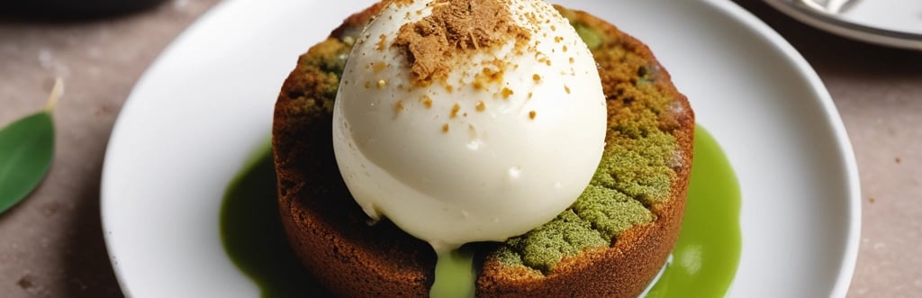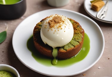 Gâteau coulant au matcha servis avec une boule de glace vanille et du spéculos (10min)
